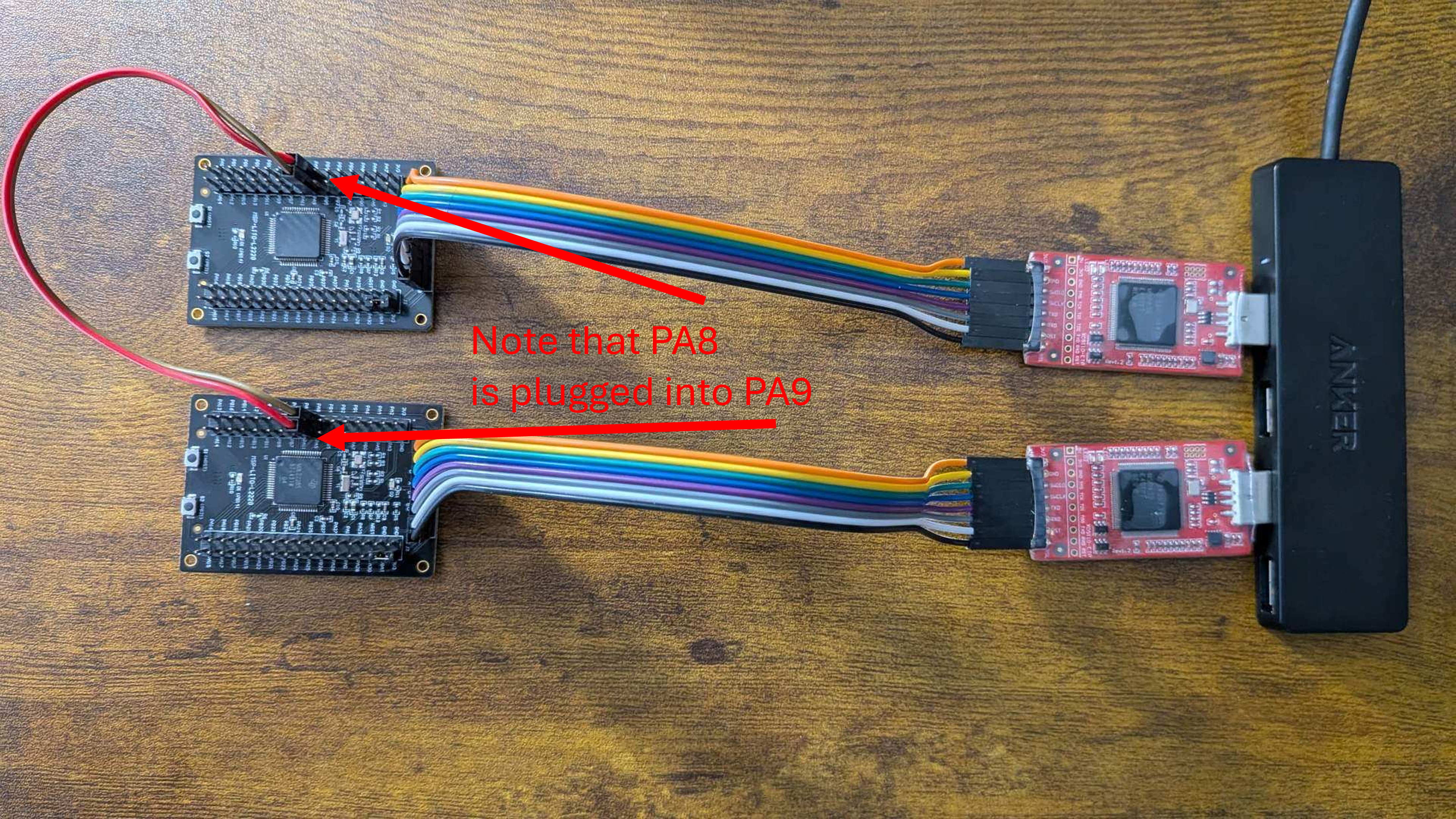 The interface for board-to-board interactions utilizes UART1 on the board, which is driven on pins PA9 (RX) and PA8 (TX).