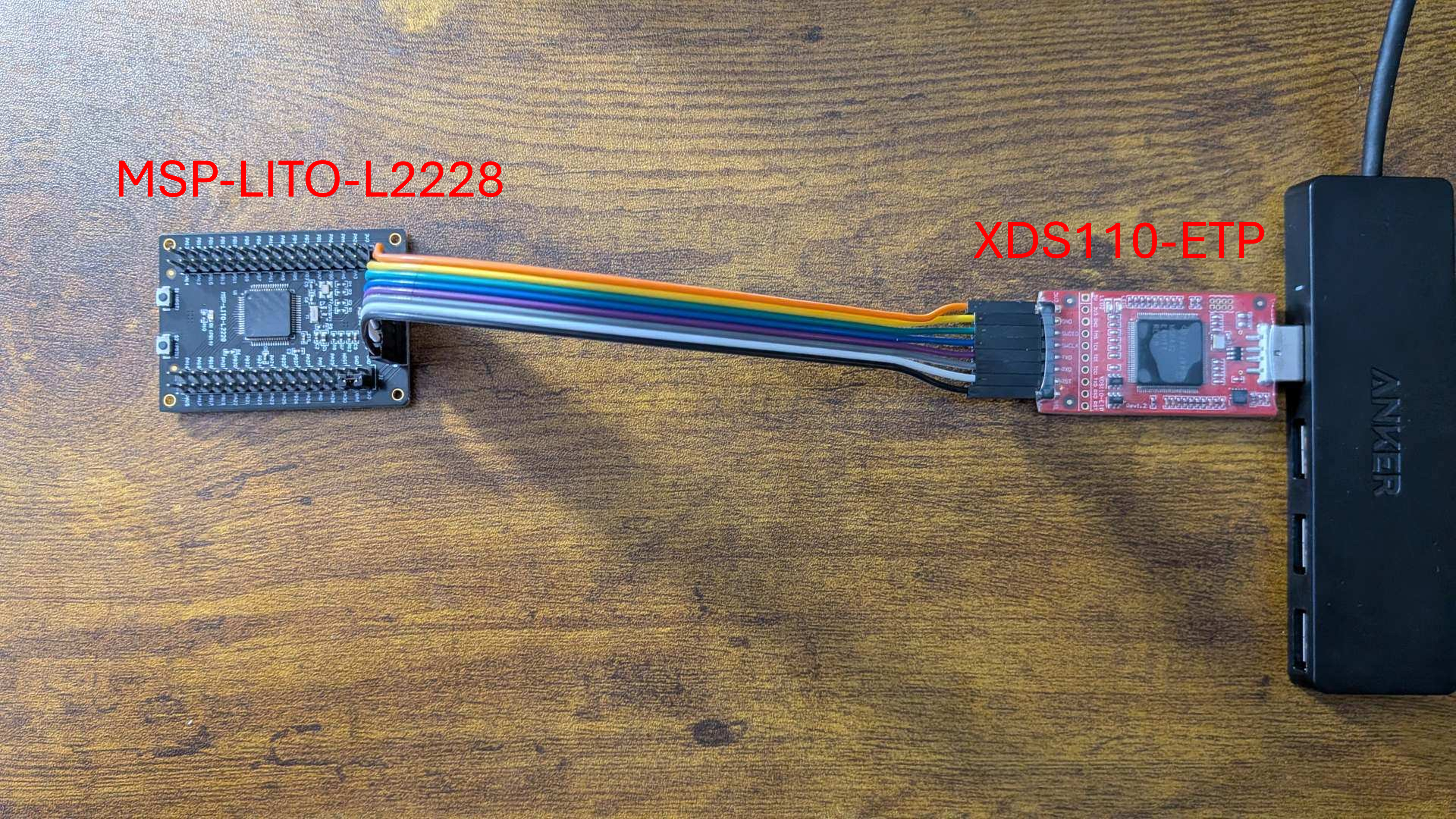 To connect the XDS110 debugger to the MSP-LITO-L2228, take 8 female-to-female jumper wires and connect them to the respective headers as pictured. Ensure that the silkscreen labels of the pins you are connecting match (e.g., 3v3 should connect to 3v3). If you connect the wrong pins, you risk damaging the board.