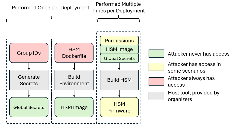 During the Attack Phase, one Deployment will be built with multiple firmware images (see Attack Phase Flags and Scenarios). Attackers will never have access to the Global Secrets.